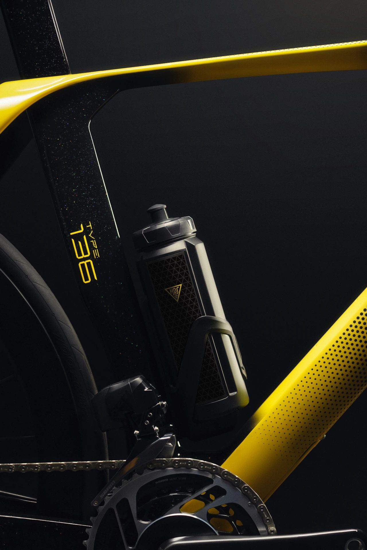 Un boîtier de pédalier compact intègre le moteur dans le cadre du vélo et la batterie électrique est déguisée en bouteille d'eau amovible.