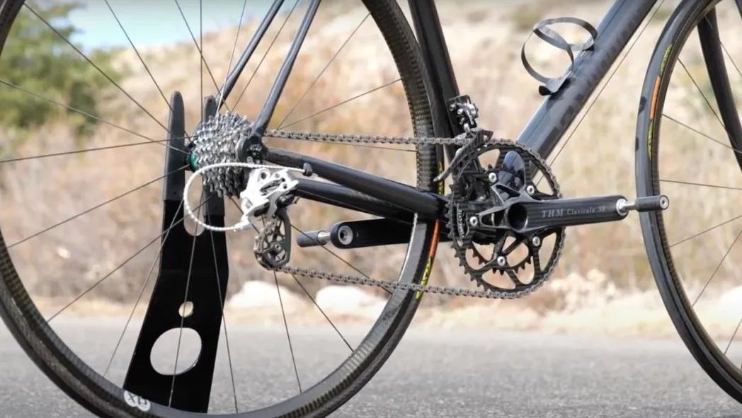 La transmission est complétée par le pédalier THM emblématique que l'on retrouve dans toute la construction de vélos ultra-légers.